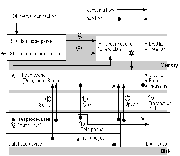 E. To process a SELECT query plan, data and index pages must be read from the database. SQL Server checks to see if the necessary pages are in the page cache. Any pages already in the page cache are used. Any pages not in the page cache are read from the appropriate database device(s) into the page cache for use.