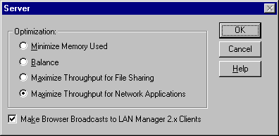 Maximize Throughput for Network Applications is the optimal setting for a SQL Server system. With this option set, network-application access to memory has priority over file-cache access to memory. Four megabytes of memory is allocated to available memory for starting up and running local applications. In addition, the amount of memory allocated to the server service for the following resources is appropriately optimized for this choice: