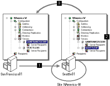 Few directory operations occur on the new server that is joining a site. Setup modifies the directory on the remote server that you specified during Setup, and then the modified directory is replicated to the new server. If Setup fails while the directory is being installed, directory information about the new server can still exist on the remote computer until it's deleted from the remote server's directory. The following illustration shows how the directory is built and how replication is initiated.