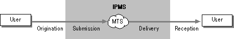 The IPMS allows messages to be exchanged from person to person. When a message is sent from one user to another, the IPMS invokes the services of the underlying MTS to submit and deliver the message to its destination. The following illustration shows how the MTS functions within the IPMS.