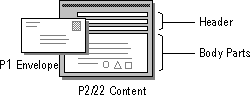 The envelope contains addressing information, including the address of the originator and recipient, the delivery priority, and message trace information. The envelope is formatted by using the P1 protocol.