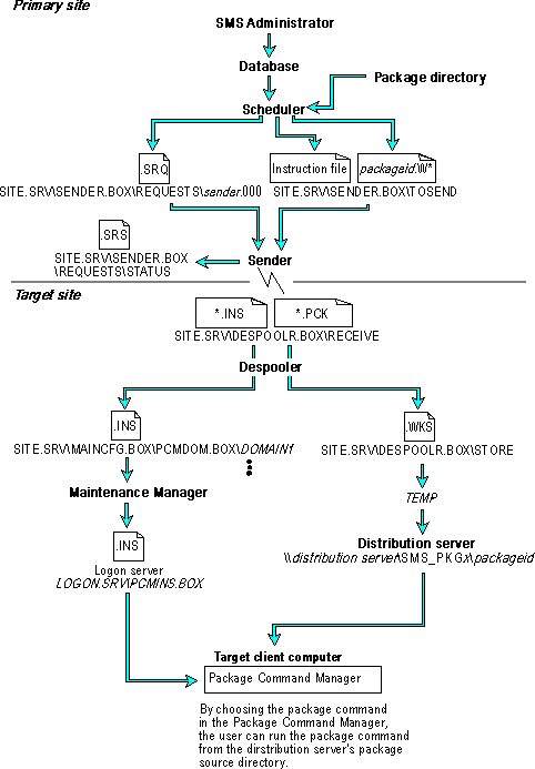 For a Run Command On Workstation job, the Despooler uses the job's despooler instruction file to create a PCM instruction file for each target client in the target site's domains. PCM instruction files contain package installation instructions for individual clients. For each domain in the site, there is a domain master box where PCM instruction files for the domain are placed. The domain master box directory is SITE.SRV\MAINCFG.BOX\PCMDOM.BOX\domain_name.000. For each target client, a PCM instruction file for the target client is placed on all SMS logon servers in the SMS domain containing that client.