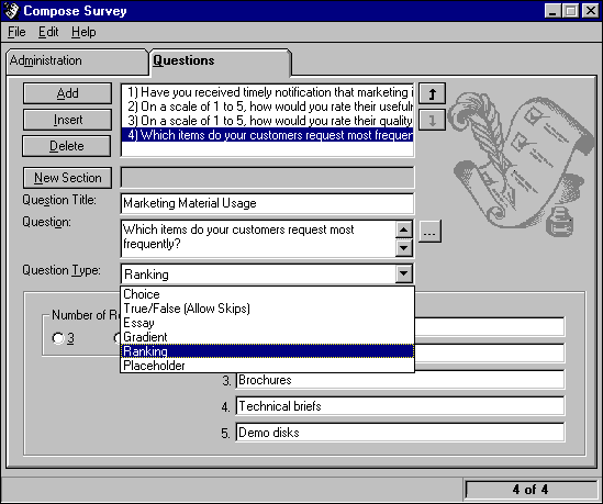 The Survey sample application is another example of the level of customization that can be incorporated into Microsoft Exchange Server groupware applications. It is a reusable survey design tool that enables end users to create surveys, either from scratch or by using another survey as a starting point. The sample application was developed with Visual Basic.