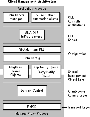 The top layer of the architecture presents SNA Server Manager information to the user. This includes the SNA Server Manager user interface and automation controllers (such as a Visual Basic application). They typically deal with configuration and management data, and receive notification of changes to the data either by polling or by implementing a special OLE object that is used to inform the application of changes to the underlying objects. The applications open a domain to initiate the reading of the configuration file and obtaining of status data from all SNA Server computers in a subdomain.