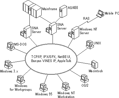Figure 2.1 SNA Server offers LAN-to-SNA gateway services supporting a broad range of LAN-based PC operating systems across popular LAN and WAN protocols.