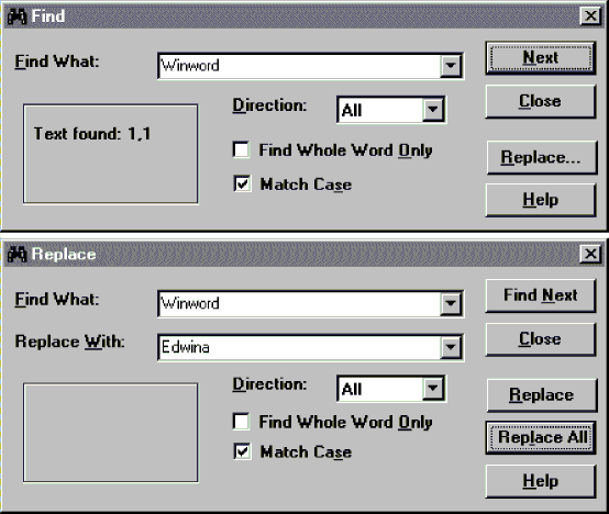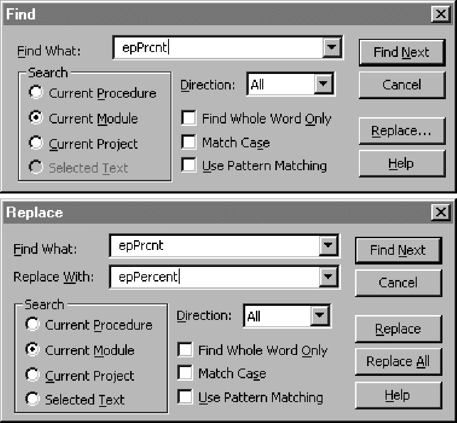 Figure 9-3. Visual Basic’s Find and Replace dialog boxes.