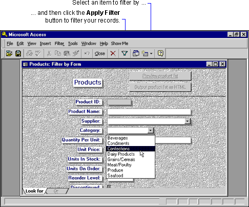 Often you know only a piece of the information you are trying to find. Filter By Selection allows you to highlight what you are looking for, and then limits your view of the data to only the items that match your selection. Filter By Form lets you use your familiar forms to find data in the same manner. Select an item from the dropdown list generated for a field, and Access 97 shows you the records that match your criteria.