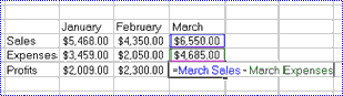 For example, in the following illustration the formula to find March profit is derived by subtracting March Expenses from March Sales. The value of March Expenses is at the intersection of the column labeled March and the row labeled Expenses.