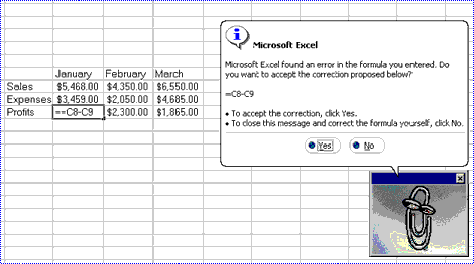Excel now fixes 15 of the most common mistakes users make when entering formulas. These mistakes are due to common typographical errors, as well as the use of syntax that is different from what Excel expects. For example, Excel can correct transposed cell references, change the semicolon (;) in a range reference to a colon (:), or add a closing parenthesis to a function's arguments. In the illustration below, Excel has corrected the common error of starting a formula with two equal signs.