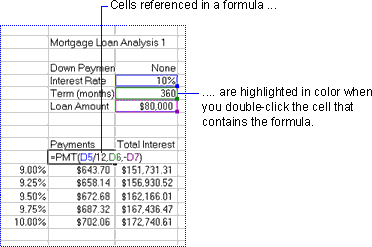 Range Finder makes it easy to trace, modify, and understand which figures make up a formula. When you doubleclick any cell that contains an equation, each part of the equation is highlighted with its own color so you can see the pieces of your formula at a glance. This feature is implemented throughout Excel, including in charts. For example, if you click a data series on a bar chart, the range in your original data is highlighted. Range Finder also allows you to use drag and drop to modify your formula or chart range.