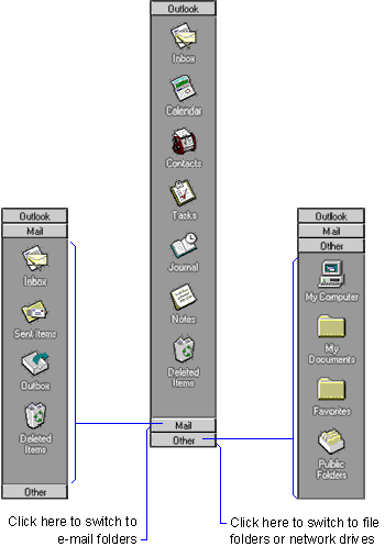 The Outlook Bar is the navigation headquarters for Outlook, housing special shortcuts that allow you to move effortlessly around the product. Using the Outlook Bar, it is easy to switch to: