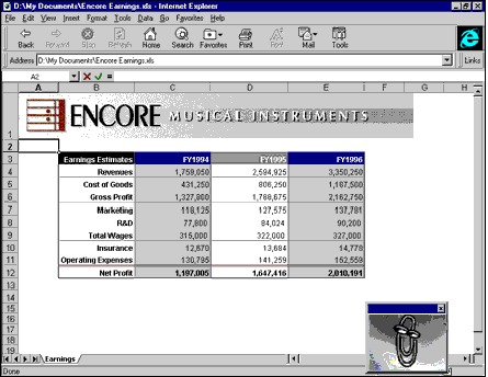 | Excel 97 (Windows) provides the ability to intelligently import data found on the Internet or an intranet for analysis. Excel seamlessly imports HTML documents found on a corporate intranet, maintaining the original formatting and turning each cell into live data, which can then be used for further analysis. To import HTML documents, click Open on File menu, and then select HTML Documents in Files of type box. Build formulas, charts, or add conditional formatting all the tools you have in Excel can be used with this data. |