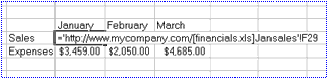 | As mentioned previously, it is now possible to create hyperlinks within Excel 97 (Windows) workbooks to files or URL addresses. But there is support for URLs in other places as well. For example, in the Open and Save dialog boxes (File menu) you can use URL addresses instead of network addresses. This feature makes it easy to open Excel files or save files to a server running the HTTP protocol using URL addresses. In addition, you can now create formulas that reference cells in spreadsheets that have URL addresses, as shown in the following illustration. |