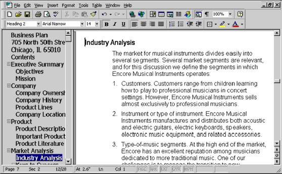The document map in Word allows you to move around in your document more easily. A split screen displays an outline of your document in the left pane, while the right pane contains the text of your document. Hyperlinks in the outline give you oneclick access to points of interest, and serve as a roadmap by highlighting the level at which you are currently located, as shown in the following illustration.