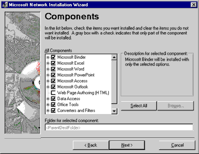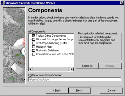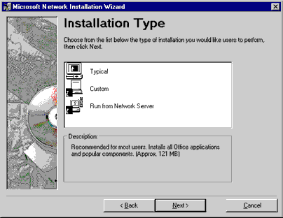Office 97 Setup offers three types of installation: Typical, Custom, and Run from Network Server. If you select Typical or Custom in the Installation Type panel, the Network Installation Wizard displays the Components panel so you can select which components you want Setup to install. If you run Setup in batch mode (/q commandline option) using the Typical or Custom installation type (/b commandline option), Setup installs the components you selected.