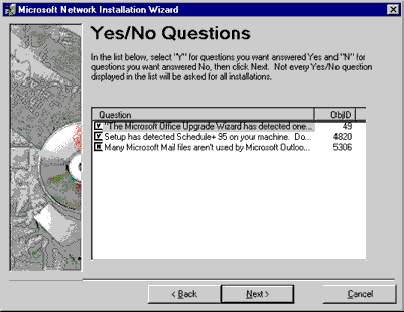 The Network Installation Wizard displays every Yes/No question that may appear during client Setup in the STF file and allows you to determine the default answers. Because a particular question may appear more than once in the STF file, the Network Installation Wizard may repeat the same question several times in the Yes/No Questions panel. To ensure that your default answer is used during client Setup, change every occurrence of the question in this panel.