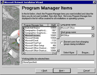 The Network Installation Wizard allows you to specify which application icons you want to install in the Program Manager group when you install Office on a computer running Windows NT Workstation 3.51. In the Program Manager Items panel, you can specify the Program Manager group and the default working folder for each item you select. The corresponding Program Manager icons are created when you install Office on a computer running Windows NT Workstation 3.51.