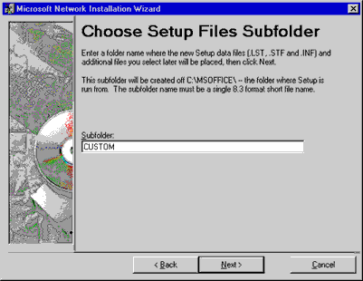For example, suppose your administrative installation point is in folder MSOffice on the network share \\Server1\Install. In the Choose Setup Files Subfolder panel of the Network Installation Wizard, you enter Custom as the name of the subfolder that contains the modified Setup files (for example, NewSetup.stf, NewSetup.inf, and NewSetup.lst). To install Office using your customized Setup files, users connect to \\Server1\Install\MSOffice and run Setup with the following command string (along with any other commandline options you require):