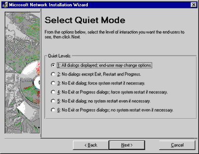 The Select Quiet Mode panel allows you to choose how you want Setup to run. When the Network Installation Wizard is finished, it displays a suggested Setup command string that includes the appropriate commandline option corresponding to the quiet mode you select in this panel.