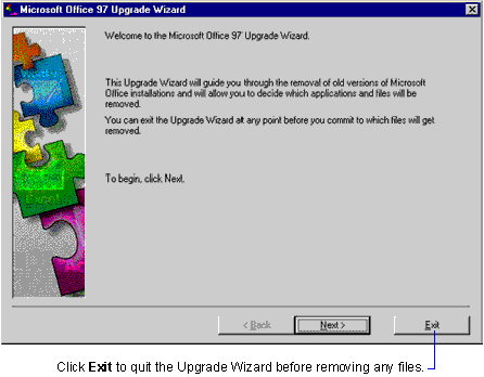 To start the Upgrade Wizard, doubleclick Offcln97.exe. The Upgrade Wizard displays a Welcome panel.