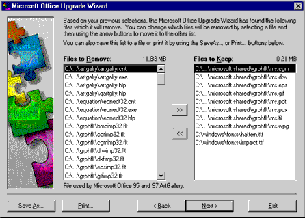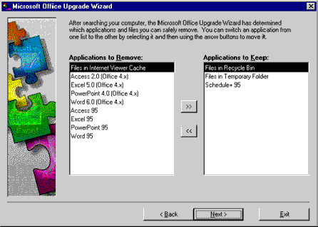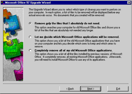 If you selected Let me decide which Microsoft Office applications will be removed, the Upgrade Wizard also gives you the choice of marking for deletion any previous Office applications currently installed on the computer. The Upgrade Wizard does not delete any files that remove functionality from other Office applications. For example, if you select to remove Microsoft Word 95 but not Microsoft Excel 95, then the Upgrade Wizard will not remove any shared files used by Excel 95.