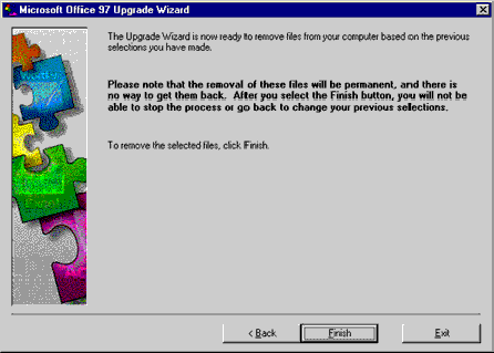 In the final panel of the Upgrade Wizard, click Finish to remove the selected files from your computer. To return to a previous panel to change options or selected files, click Back. Click Exit to quit the Upgrade Wizard before any files are removed.
