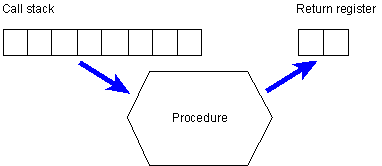 To illustrate how this change in size can affect a call, recall the fictional MyAPICall API used earlier. The MyAPICall call needs the handle to the application's window (HWND), a string, a character, and an integer to be placed on the stack. In C, the function would be: