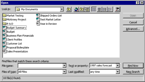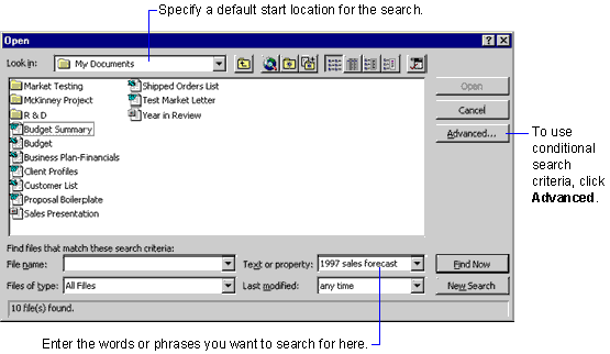 Tip In the Advanced Find dialog box, you can specify more complex search criteria using AND and OR conditional values. To display the dialog box, click Open on the File menu of any Office application, and then click Advanced. For more information about using search criteria in the Advanced Find dialog box, see online Help.