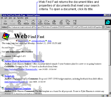 After the user submits a Web Find Fast query, Web Find Fast processes the request and returns a list of the found documents in an HTML document, Results.htm.