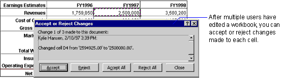When two or more users of a shared workbook make conflicting changes (for example, entering different values in the same cell), users can either review the conflicts or automatically save their own changes when they save the workbook. Users set this option for themselves in the Conflicting changes between users group on the Advanced tab in the Share Workbook dialog box (Tools menu). If users choose to review changes, they see a dialog box similar to the following when they either save a workbook to which another user has made conflicting changes, or when the Update changes time value is met.