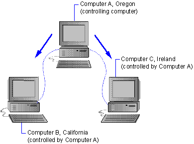 A presentation conference consists of the presenter (or conference owner) and the audience (or conference participants). The following diagram illustrates a presentation conference. Computer A, located in Oregon, is the conference owner and controls the presentation. Computer B in California and Computer C in Ireland are conference participants, or nodes, linked to the conference owner.