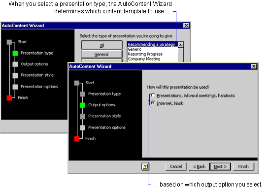 Each type of presentation in the AutoContent Wizard has two templates associated with it: one for standard presentations and one for online documents. If you select the Presentations, informal meetings, handouts option on the Output option panel in the AutoContent Wizard, then the wizard bases your presentation on the standard presentation template. If you select the Internet, kiosk option, the AutoContent Wizard bases your presentation on the online document template.
