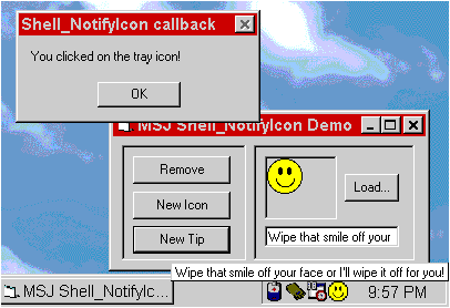 But back to the Shell_NotifyIcon function. (There has to be some point to all this C++ work!) A program needs to do two things to put its icon down in the "tray" (so nicknamed because of its recessed 3D look.) First, it needs to fill a structure of type NOTIFYICONDATA. This includes the program's hWnd, a message ID, an icon, and a tip string.