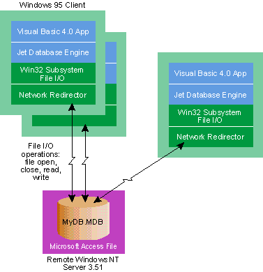 Figure 1 shows the architecture of a single-user, personal database application. Figure 2 shows the configuration of a multiuser remote database system. Here, the clients run the interface (your application), which calls the Jet engine. While this is a multiuser system, it's still a far cry from a true client/server configuration. Every client has its own copy of the Jet engine, and the server is used for nothing more than shared disk space.