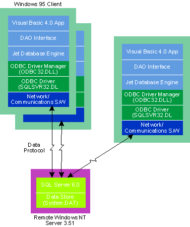 OK, so what if you want a true client/server system? Well, we're almost there—except for one minor problem: Jet is not a true client/server database engine. Luckily, Jet can provide access to a full-featured database server like SQL Server 6.0 via ODBC as shown in Figure 3. Here the Jet engine does not update the physical data store directly. It connects to the ODBC data source, optimizes queries, and acts as a general conduit of data between your application and the real database engine (such as Microsoft SQL Server). This allows one database engine to control access to the data, as opposed to having each client's Jet engine attempt to cooperate with other clients' Jet engines.
