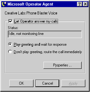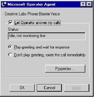 The Operator Agent may answer calls on behalf of all running telephony applications. It can then either play a greeting (prompting for touch tones to identify the caller as a fax, modem, or human) or route the call immediately according to a selected routing priority. The routing priorities are selected by clicking the Properties button and then the Call Routing Priorities button on the Properties dialog (see Figure 11). The Operator Agent does not get involved in calls identified by a distinctive ring pattern because the type of call is known by Unimodem before the call is answered and Unimodem can route the call to the appropriate app.