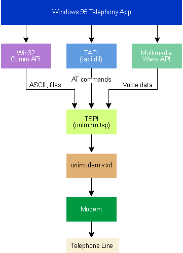TAPI is a collection of Win32 APIs that manage phone calls. TAPI function calls typically end up sending AT (or AT+V) commands to your modem. The TAPI APIs are contained in tapi.dll, which in turn calls the Telephony Service Provider (TSP) API. Windows 95 modem functions are contained in a TSP, implemented in a DLL called unimdm.tsp. Unimodem translates TSPI calls into AT or AT+V commands, and sends the commands to unimodem.vxd, a virtual device driver that actually talks to the modem. It's all very confusing, but Figure 2 should help make things clear.