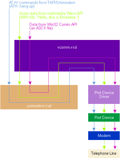 TAPI doesn't get into the data business; all it does is manage phone calls. When it's time to send data over the phone line, you must invoke some other API such as the Win32 comm API for sending ASCII or binary data (see "Create Communications Programs for Windows 95 with the Win32 Comm API," MSJ, December 1994), or the multimedia Wave API for sending voice data. One of the functions in TAPI is lineGetID, which gets the device ID for the wave device associated with a telephone call. You can use this ID just like any other wave ID to play or record sounds to or from the phone line, using standard multimedia functions like waveOutOpen and waveOutWrite. Instead of coming out of your PC's speakers, the sound goes out over the phone line. I'll come back to lineGetID later; right now, I want to take you on a little tour of the grungy stuff that goes on behind the scenes with Unimodem. It's actually a bit more complicated than Figure 2 suggests.