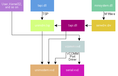 To get around the first problem (internal versus external), Unimodem calls back into the Windows 95 virtual communication driver (VCOMM) to talk to the modem through a serial port driver, as shown in Figure 3. Unimodem.vxd sends both command strings and data to the modem via VCOMM and the port driver. The commands come from TAPI via unimdm.tsp; the data comes from either the Win32 comm API or the multimedia wave API.