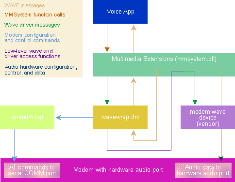 For modems that use a separate hardware audio port, Microsoft provides a "wave wrapper" DLL for synchronizing the audio data. The multimedia system calls wavewrap.drv, which in turn calls Unimodem to send AT+V commands that support audio data transfer (for example, to place the modem in voice transfer mode). After the commands are completed, the wrapper calls back into mmsystem.dll to play the audio. mmsystem.dll calls a vendor-supplied modem wave device driver to transfer the audio data (see Figure 5). The modem wave device interfaces to the audio hardware interface only. Modem vendors take note: if you have an existing modem wave driver, you must remove any direct access to the serial comm port and let the wave wrapper send AT commands to the modem.