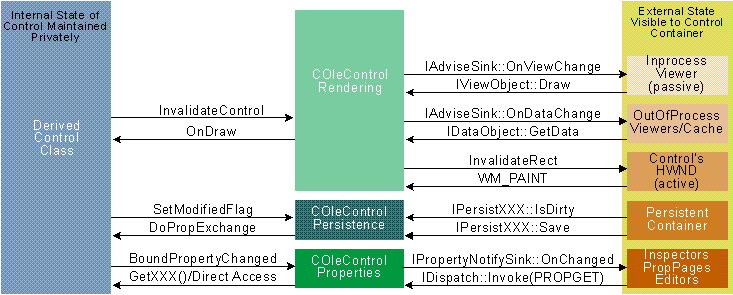 AThe fact that your control's visual state is consistent with its property values indicates that you got the basics of state synchronization correct. Figure 1 shows the overall notification and request diagram for controls. As you can see, a control's state can be modeled in terms of internal and external states. The transient values of the control's data members are the control's internal state. The persistent image of the control on disk and the visual image on the user's display can be viewed as the external state of the control. The control implementor is typically focused on the internal state of the control, since this is its data member. It's manipulated via the control's methods, where control implementors spend most of their time adding features, bugs, and Easter eggs. It is important, however, to ensure that the internal and external states of the control are always in synch. Fortunately, the COleControl class makes this simple.