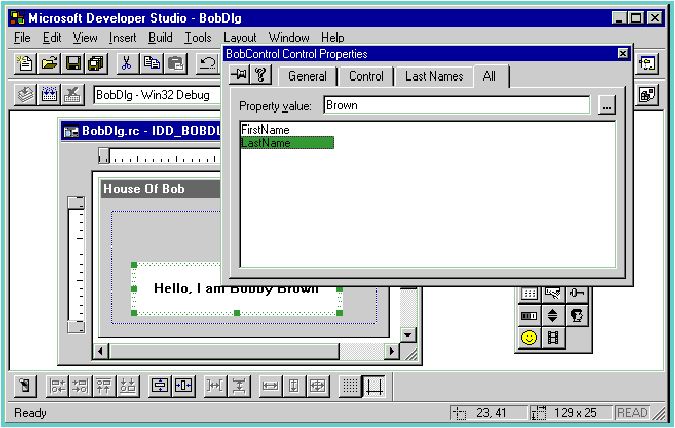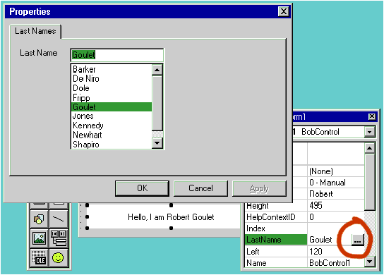 Based on this implementation, when the user selects the LastName property in the Visual Basic property browser, the ellipsis button will be shown. When clicked, the button invokes a property sheet with only the page indicated in the code above. This is somewhat different from the behavior of the Visual C++ generic property browser (see Figure 10), which is implemented as one property page in the dialog editor's property sheet. This also contains the dialog's property page in addition to all property pages in the selected control's property page map. When attempting to edit a property with a custom property page, Visual C++ simply jumps to the indicated property page within the same sheet. This implies that the custom property page must be part of the control's property page map, which is not required by Visual Basic.