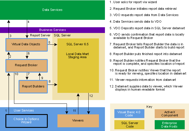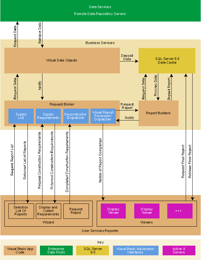 Business services will consist of a middle tier of remote automation servers known collectively as the Report Server. The components of the Report Server consist of one or more virtual data objects, one Request Broker, and one or more Report Builders. They will be written in 32-bit Visual Basic 4.0 and run on Windows NT Server, again using integrated security. They are out-of-process ActiveX servers (EXEs), which allows them to run in separate processes/machines. The business services will also be running Microsoft SQL Server 6.5 as a local datamart staging area for the data pulled from the various remote data repositories and for use by the Report Server components for storing programmatic and configuration information. Scalability can be handled in three ways: first, you could separate the Report Server components and the SQL Server onto separate machines, and, if necessary, separate the ActiveX servers across several machines; second, you could implement multiple instances of the Report Server components; and third, you could implement a second SQL Server for two-tier data cache, also if need dictates. For this prototype, all the servers are running on the same machine.