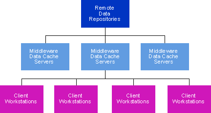 Data is retrieved from remote data repository servers, which are the above-described wide variety of DBMSs across the enterprise. As shown above, the client requests data retrieval through the virtual data object components of the Report Server, and it stays in the local cache only while the client remains connected to the application.