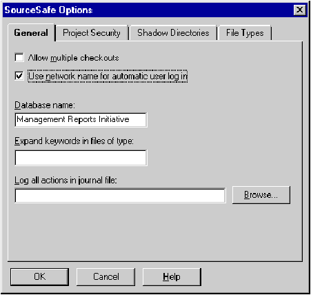 When setting up the Visual SourceSafe database for the prototype application files, selecting the "Use network name for automatic user login" option in the 32-bit Administrator will enable Windows NT integrated security (see Figure 2). The project and each module should be checked in as they are created.