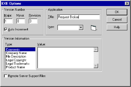 When building the ActiveX server executables, the EXE Options dialog box (see Figure 3) provides three levels of significance for entering version information—major, minor, and revision. This is the data that appears when File Properties is selected in the Windows¨ Explorer. Selecting the Auto Increment checkbox will automatically roll future revisions of the EXE forward.