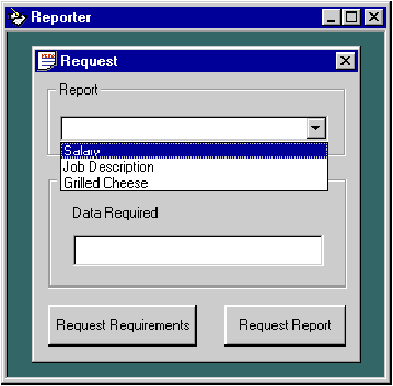 In the prototype, a simple client interface will give the user a list of reports to choose from (see Figure 4). After selecting a report, the user will click a command button to continue. The code shown in Figure 5 will then be executed, passing the name of the chosen report and an empty requirements object, which has form-level scope, to the Request Broker.