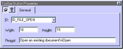 It is easy to modify the ToolTip strings after you have generated the application. Open the toolbar in the resource view. Double-click any toolbar button to display the Toolbar Button Properties dialog for that button, then edit the prompt line after the \n to change the ToolTip text. For example, in Figure 2, editing "Open" after the \n modifies the ToolTip text. The string before the \n is the text that appears in the status line when the ToolTip is displayed.