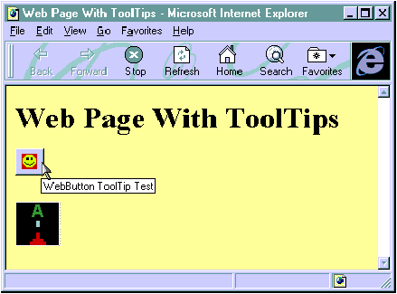 Like applications, Web pages can benefit from ToolTips. There are two obvious ways to use ToolTips on Web pages: ToolTips for graphics and ToolTips for ActiveX controls. The sample control for this article is a button that I wrote to demonstrate how simple it is to add ToolTips to ActiveX controls. Figure 3 shows both the ActiveX control and a graphic image. The ActiveX control is the button with the smiley face. The graphic is the little bit of "art" just below the button.