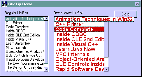 Other types of tips have started to appear in other situations as well. There are TitleTips to extend the title of tree or listbox controls, DataTips to provide details about data in the window, and ToolTips for Web pages. In this article, I'll provide a comprehensive primer on adding tips to your application, from adding simple MFC-supplied ToolTips to writing custom TitleTips. Along the way, I'll even give you some pointers on adding ToolTips to your Web pages, including a simple ActiveX™ button control that has ToolTips. But before I begin discussing the specifics, let's briefly review MFC class support for ToolTips.